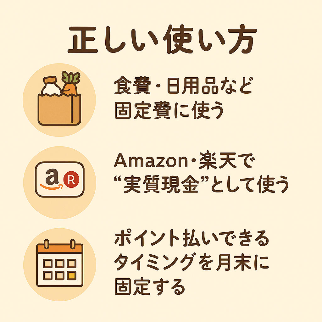 →「ポイントで生活費を浮かせる=実質現金が貯まる」状態を作るのが理想