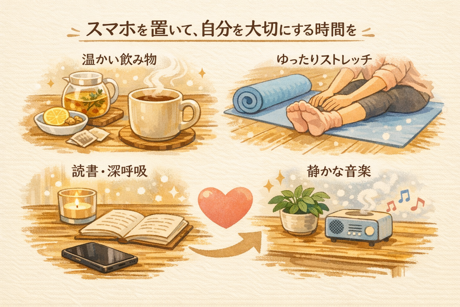 スマホの代わりに、心と体を休める時間を選ぶことが大切です。