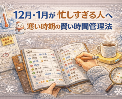 いつもの時間管理では回らなくて当たり前 12月と1月は、どうしてこんなに忙しいのでしょうか。 年末の締め切り、忘年会や行事、大掃除や帰省、年始の準備や挨拶。そこに寒さが加わり、体も気力も消耗しがちです。 「やることが多す・・・