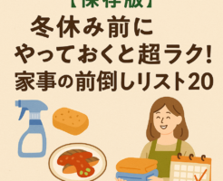 冬休み前に前倒ししておくと、家事は圧倒的にラクになる 冬休みはイベント続きで、気づけば家事が後回しになりがち。「年末のバタバタを少しでもラクにしたい!」という方のために、 冬休み前に“前倒ししておくと圧倒的にラクになる家・・・